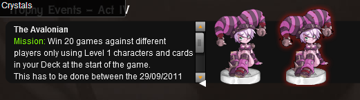 Win 20 games against different players only using Level 1 characters and cards in your Deck at the start of the game. You will win the Without Fear... and the title: The Avalonian.